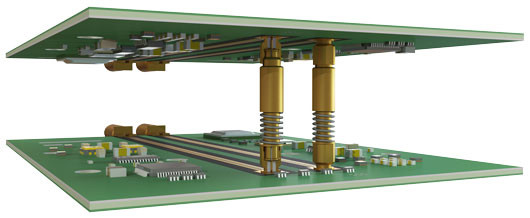 A 'Board-to-Board' RF connection conveys an RF Signal between two parallel RF printed circuit boards using RF connectors. SV Microwave uses connectors with SMP, SMPM, and SMPS series for this configuration, which generally consists of two PCB surface-mount male connectors and a female-female adapter, or 'bullet'.