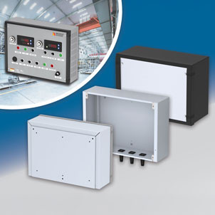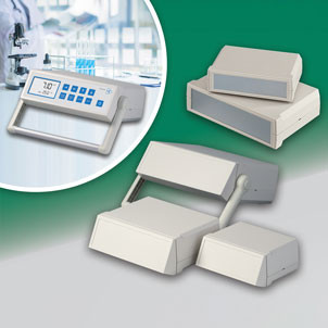 OKW’s MOTEC plastic enclosures for desktop electronics can now be specified with a sloping front panel and an adjustable carry handle/desk stand for easier viewing and operation. The stylish enclosure is ideal for measuring and control,