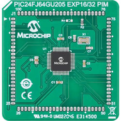 The Microchip Technology PIC24FJ64GU205 General Purpose Plug-in Module (PIM) is designed to demonstrate the capabilities of the PIC24FJ64GP205 and PIC24FJ64GU205 family using the Explorer 16/32 Development Board (DM240001-2). The solution i